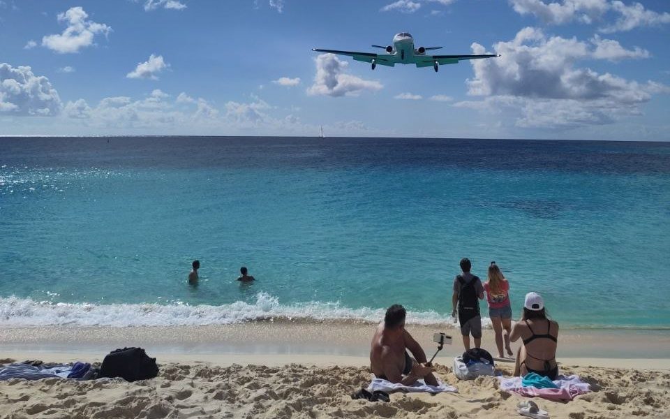 Le jour du voyage a été une longue journée : levés à 5h30 pour prendre le RER jusqu’à Charles de Gaulle, embarquement à 8h45, décollage à 9h30. Arrivés à 13h30 heure locale mais 19h30 pour nos cerveaux ! On a suivi le décollage et surtout l’atterrissage de l’avion depuis les écrans installés devant nos sièges : l’avion est équipé d’une caméra devant et une caméra dessous. C’est particulièrement impressionnant à Saint-Martin parce qu’il y une plage quelques mètres devant la piste d’atterrissage. Une fois arrivés, on est allés voir ce que ça donnait en vrai. Ça fait un boucan de l’enfer, ça sent très mauvais et surtout on s’est retrouvés sur la plage derrière un avion qui préparait son décollage et ça c’était une bien mauvaise surprise : l’air brûlant dégagé par l’avion a provoqué une tempête de sable et un souffle incroyable.